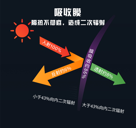 是在膜上添加了吸熱劑,猶如一塊海綿吸收約86%的熱量,吸熱飽和后,溫度飆升,造成第二次輻射。熱量不斷傳向車內(nèi),此時(shí)您愛車的空調(diào)負(fù)荷不但沒有減輕,反而是超負(fù)荷運(yùn)作,油耗飆高。